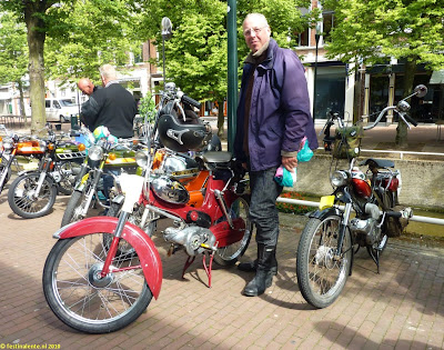 Het zijn maar bespiegelingen. Gelukkig zijn er veel mensen die er anders mee omgaan. Ik sprak met Henk van Doorn, die op zaterdag met een clubje geestverwanten vanuit Utrecht naar Harlingen was gebromd, bepakt met tent en slaapzak. “Heerlijk onthaasten,” zei hij tegen mij. Apetrots was hij op zijn Puch uit 1959, één van de oudste in het land, zo dacht hij. “Ik heb deze Puch gekocht in Duitsland. Het is een Oostenrijkse versie. Kijk maar, dat kan je zien aan het dekseltje over de ontstekingsmagneet. En hij heeft geen geel plaatje en geen wit achterspatbord. Dat was alleen in Nederland verplicht. De kleuren werden ook niet zo geleverd in Nederland.”